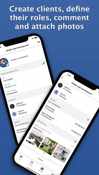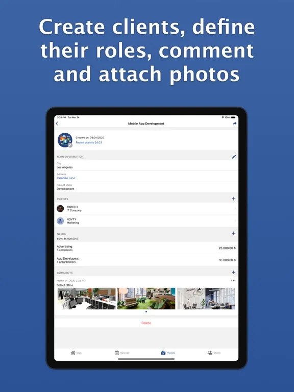 • Track projects and connected clients, define their roles, make comments and attach photos