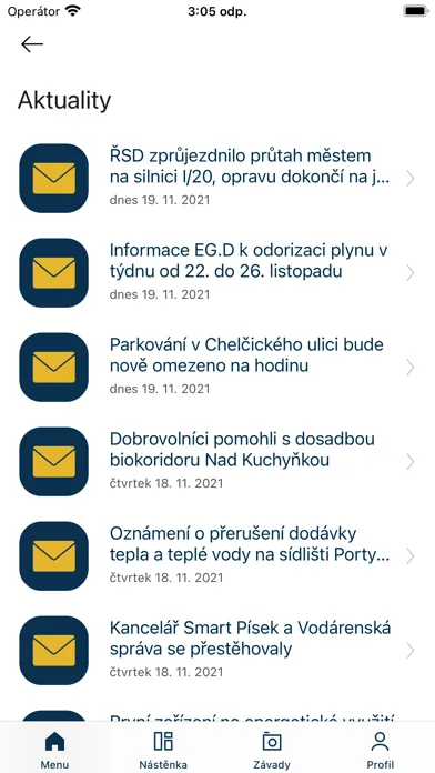 • Hlášení závad – upozornění od občanů na nedostatky ve městě a jejich správa vedením města.