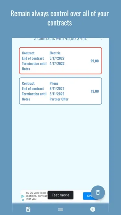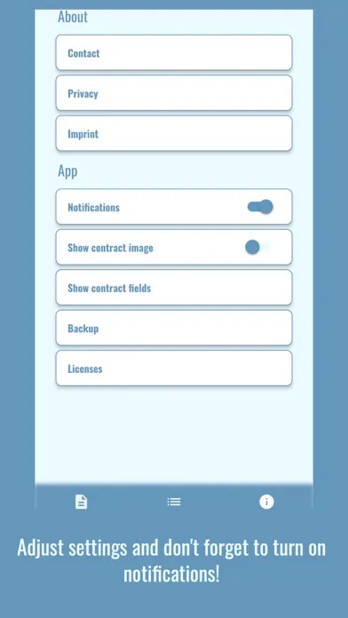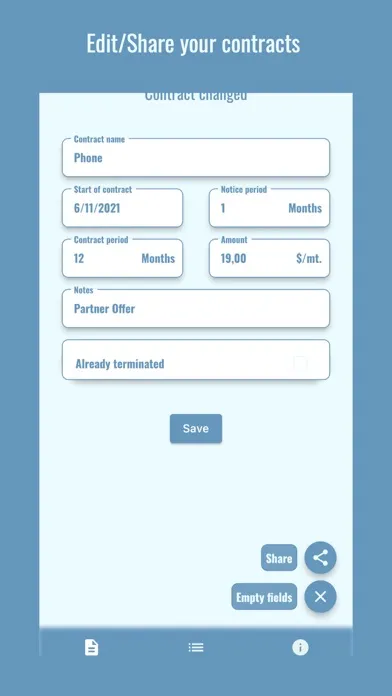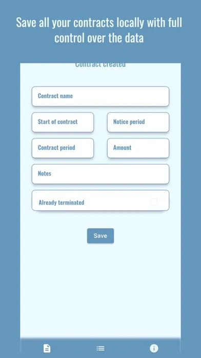 For each contract, you can optionally enter additional data (such as data on the contract partner and details of the contract), as well as a picture of the contract. All this data is saved locally only and will not be reused or shared!