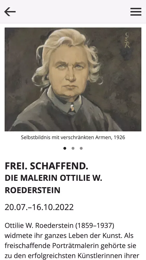Ottilie W. Roederstein (1859–1937) widmete ihr ganzes Leben der Kunst. Als freischaffende Porträtmalerin gehörte sie zu den erfolgreichsten Künstlerinnen ihrer Zeit und ihre Gemälde erlangten internationale Beachtung. Durch ihr Schaffen erreichte sie finanzielle Unabhängigkeit und eroberte sich gesellschaftliche Freiräume, die den meisten ihrer Zeitgenossinnen verwehrt waren. Heute ist die Malerin trotz ihrer regen Ausstellungstätigkeit und ihres einstigen Bekanntheitsgrades einem größeren Publikum nahezu unbekannt. Die Ausstellung widmet sich Roedersteins spezifischer Malweise, ihrer Rolle und Wirkung als Netzwerkerin und Künstlerin sowie ihrer engen Verbundenheit mit Frankfurt und der Region.