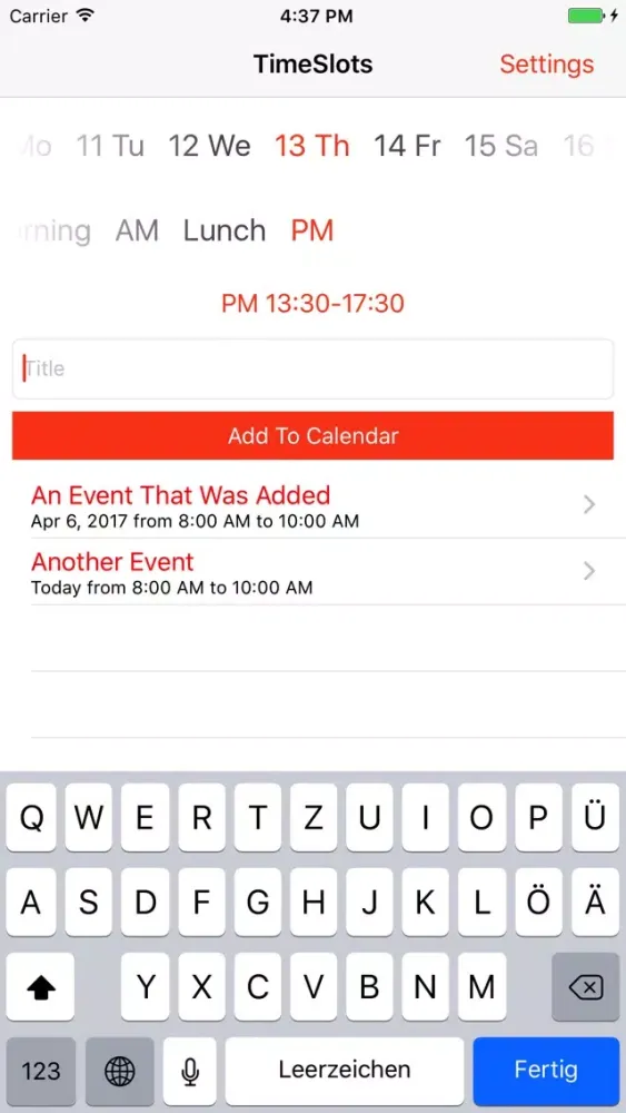 If you always add events at the same time (e.g., for lessons, meetings, or appointments), TimeSlotCal enables you to add these events faster than with any other app: Simply start, enter your day, the Time Slot and a title, and you're done!