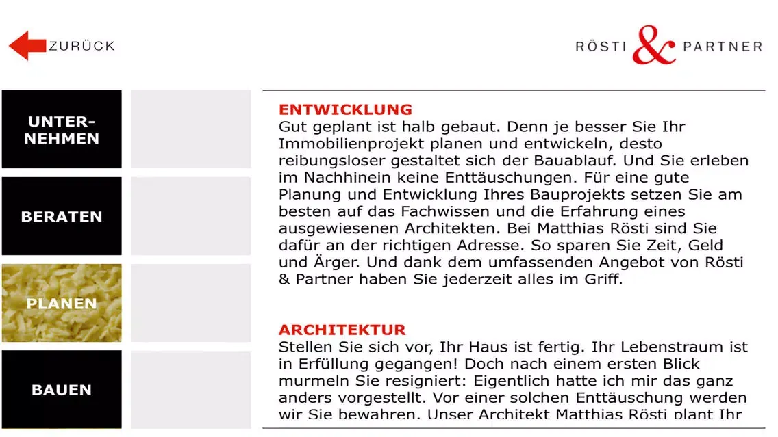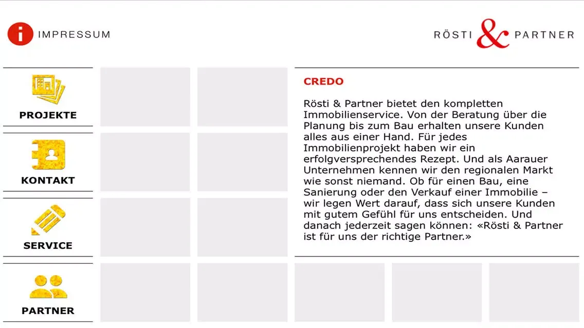 Hier präsentiert sich das Unternehmen Rösti & Partner AG aus Aarau (Schweiz) mit ihren Leistungen und Referenzfotos. Bei Interesse können Sie mit dem Unternehmen über die App in Kontakt treten.