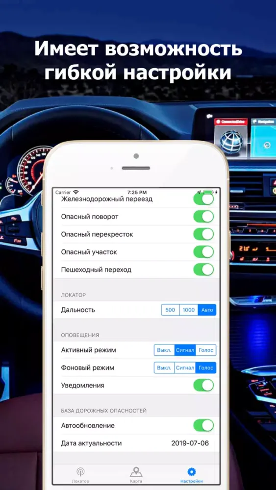 • Фоновый режим - обеспечивает визуальные (push-уведомления), а так же звуковые\голосовые оповещения о приближающейся опасности когда приложение свернуто. Так же НЕ требует доступа в интернет.