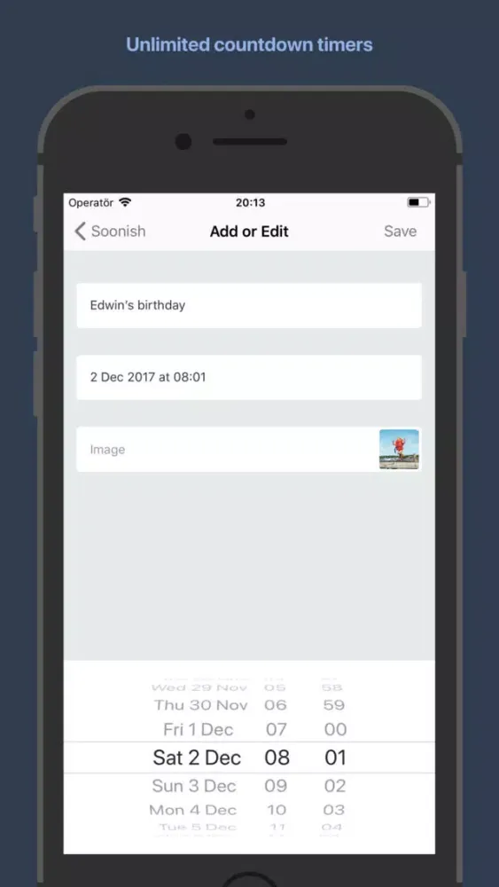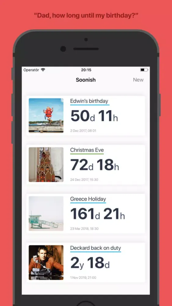 Soonish adds count down timers for your events. Counting down for example to birthdays, to family holidays or to your retirement. If you have kids that asks you how long until Christmas, their birthdays and when they are big enough to do X every morning before breakfast. Well, then I made this app for you too.