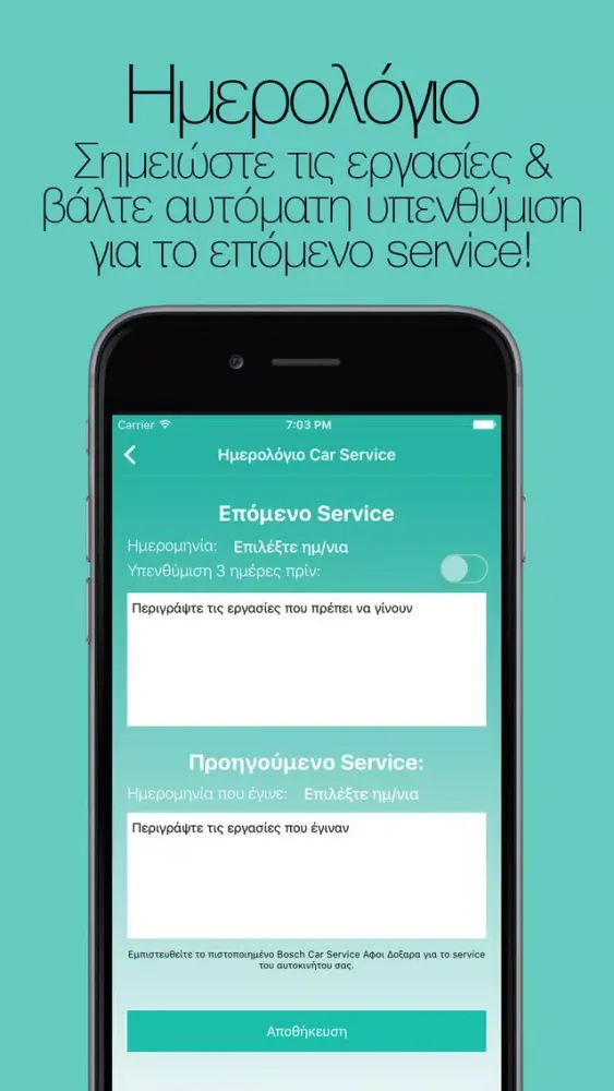 - Ημερολόγιο Αυτοκινήτου. Στην ενότητα αυτή μπορείτε να σημειώσετε τις εργασίες του προηγούμενου αλλα και του επόμενου service και η εφαρμογή θα σας υπενθυμίσει εγκαίρως ώστε να ξεχάσετε το επόμενo service, που τόσο σημαντικό είναι για το κάθε αυτοκίνητο.