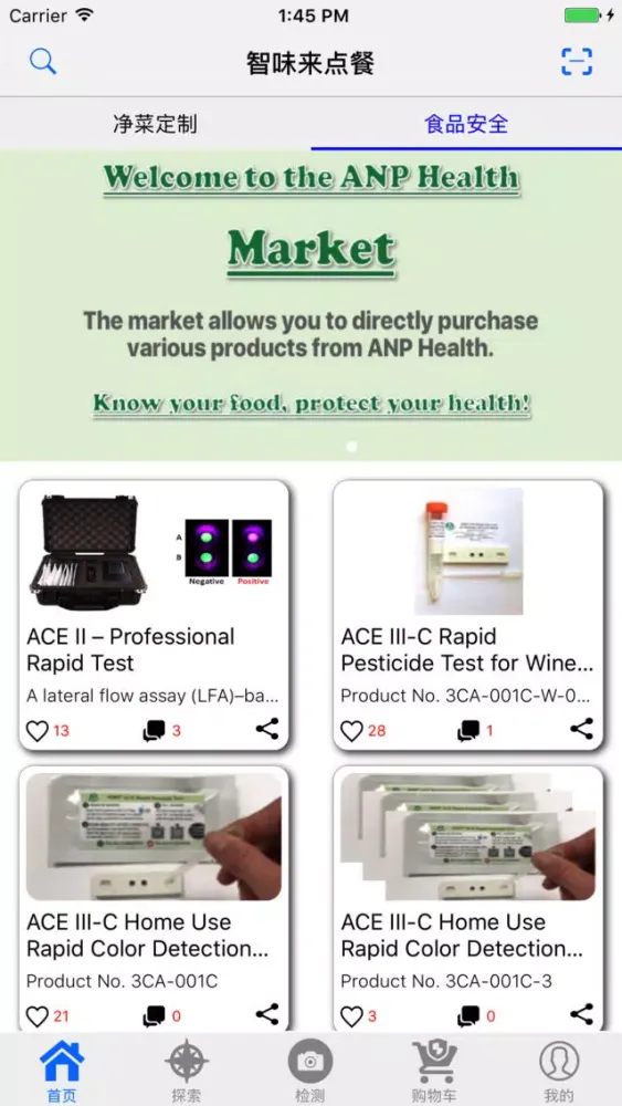 食品安全检测平台,可以快速的对购买的食品进行安全检测,杜绝农药、重金属超标的食物。存储检测结果,记录健康生活。