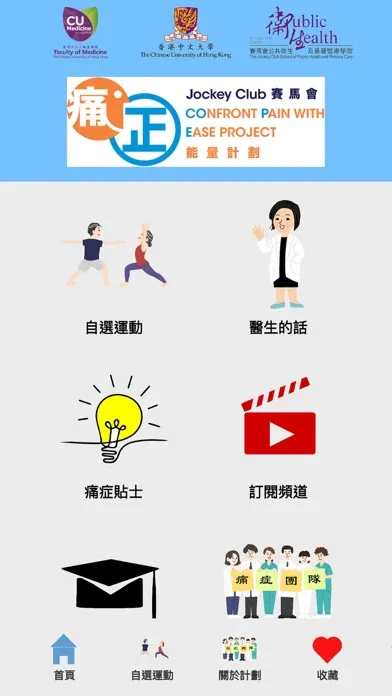 「中大痛症」為你提供不同肌骼部位的復康動作、伸展及其他舒緩痛症的運動。整個計劃由家庭醫學教授及物理治療師監督,針對您患有痛症的部位提供支援。