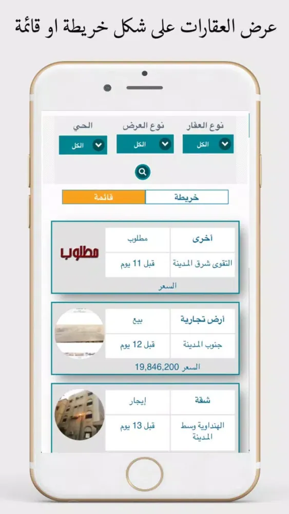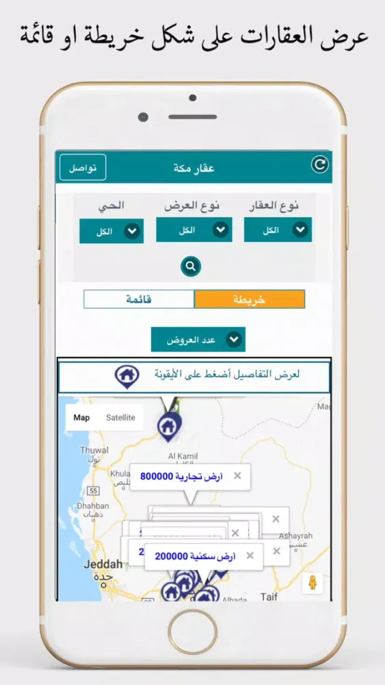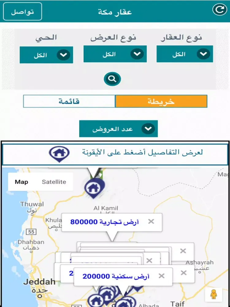 تطبيق عقار مكة، يعرض جميع العقارات في مكة بواجهة سهلة التعامل و الاستخدام عن طريق عرض العقارات المطروحة على شكل قائمة او خريطة