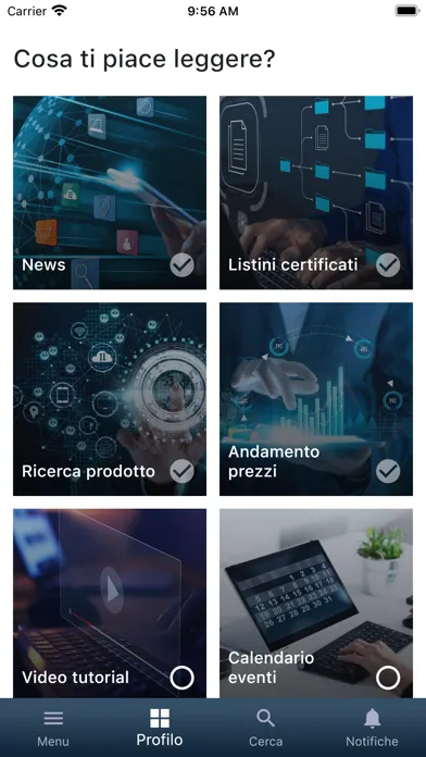 Al primo accesso potrai scegliere, tra quelle selezionabili, le categorie e gli hashtag di tuo interesse. Inoltre, avrai la possibilità di ricevere notifiche per le categorie selezionate.