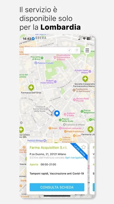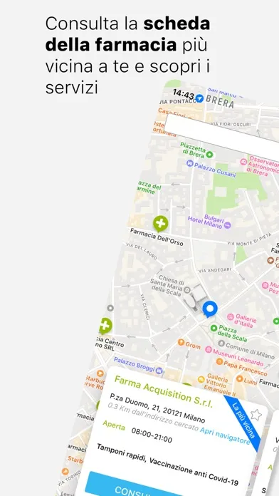L'applicazione permette di trovare la farmacia aperta più vicina alla propria posizione o ad un luogo desiderato, sia nel momento stesso della ricerca, che in altri intervalli di tempo.