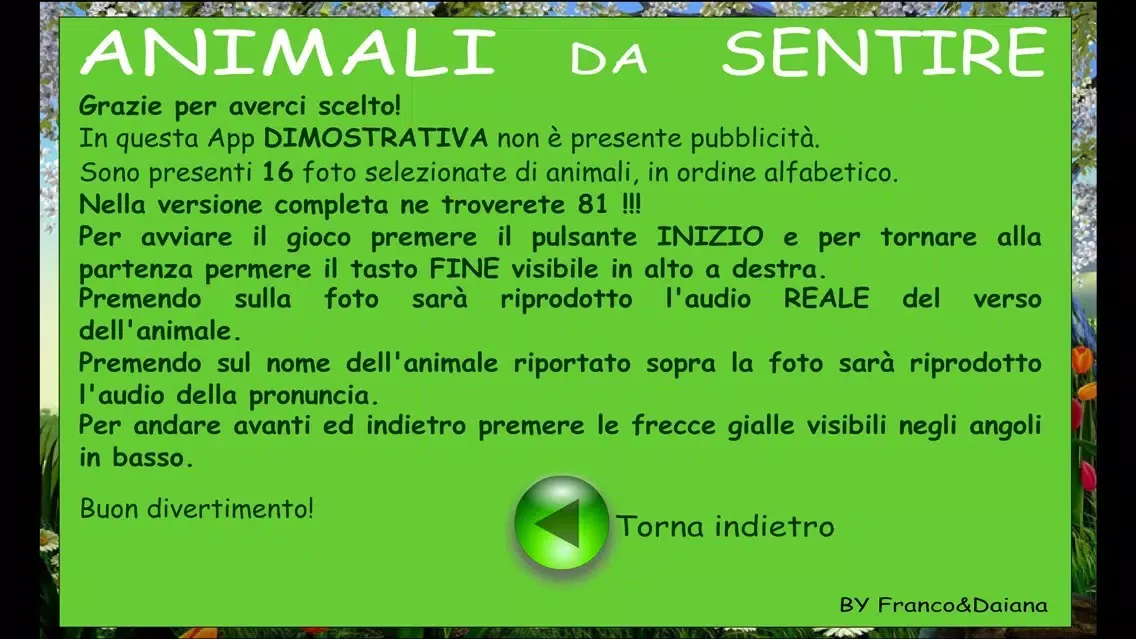 L'applicazione dimostrativa dispone di 16 fotografie, suoni dei versi e relativa pronuncia, degli animali più comuni del mondo.