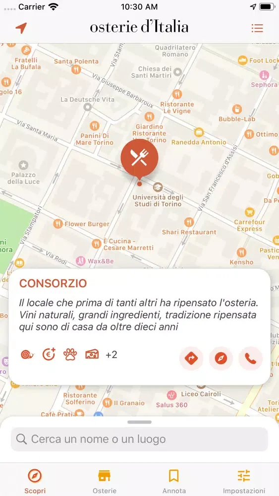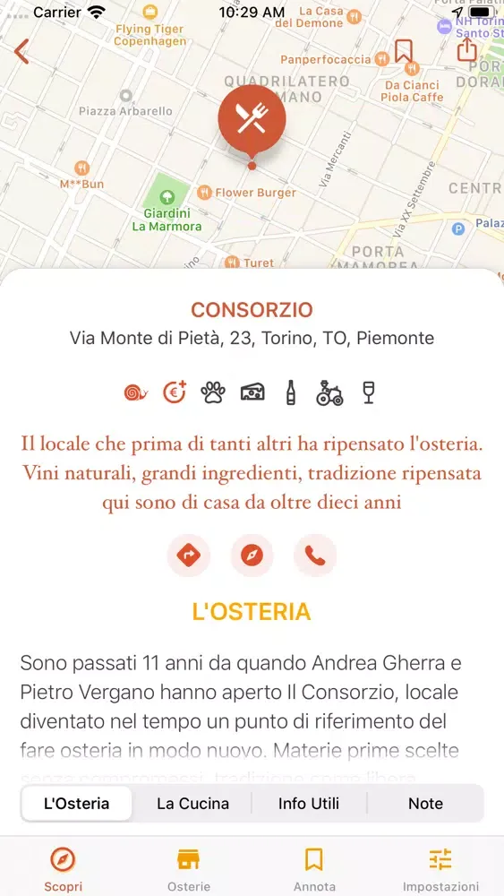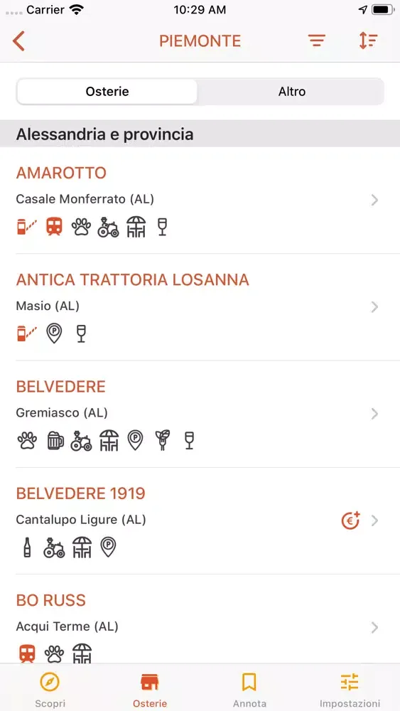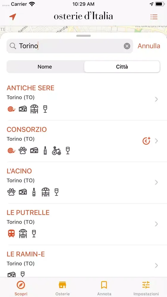 Indicazioni e filtri segnalano le osterie vicine a una stazione ferroviaria o a un casello autostradale.