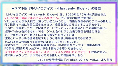 『ルリイロデイズ ~Heavenly Blue~』は、2020年にWindowsPC向けに発売されたVTuberが主 演のフルボイス・ノベルゲーム。その最大の特徴と魅力は、何と言ってもVTuberたちが本人役で出演しているということ。普段は配信の向こうにいる推しと、同じ世界で一緒に学園生活を送ったり、恋愛を楽しんだりすることができる。さらに、所謂キャラゲーに留まらず、ビジュアルノベル単体として完成度が高いことも大きい。出演VTuberを知らない人でも、ゲームをクリアした後で配信を覗きに行き、そこで確かに生きて動いている彼ら彼女らを目にすれば、現実とバーチャルの境界を越えたような不思議な感動を覚えるだろう。そんな本作の発売から1周年を迎える2021年11月22日、待望のスマートフォン移植版が登場する。UIの変更やチャプター機能の追加、PC版では別売りだったアペンドを本編内から購入できるなど、より手軽にプレイできるよう、スマートフォンに適したアップデートが施される。是非チェックして、いつでもどこでも推しとの物語を楽しもう!