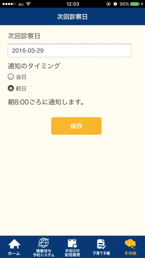 子育て手帳や次回診療日の通知など、アプリならでは限定サービスが搭載されています。