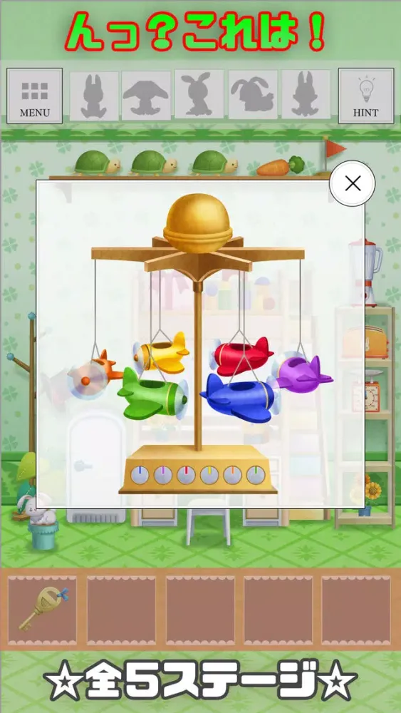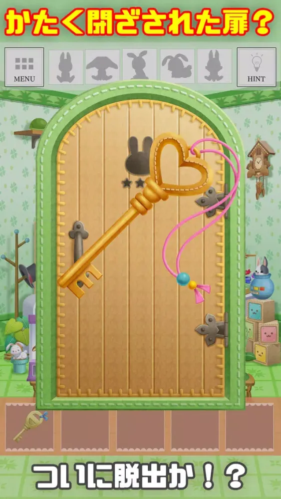 ・各ステージ毎にウサギのぬいぐるみを5匹集めると「鍵」と「脱出扉」が出現しクリアになるよ。