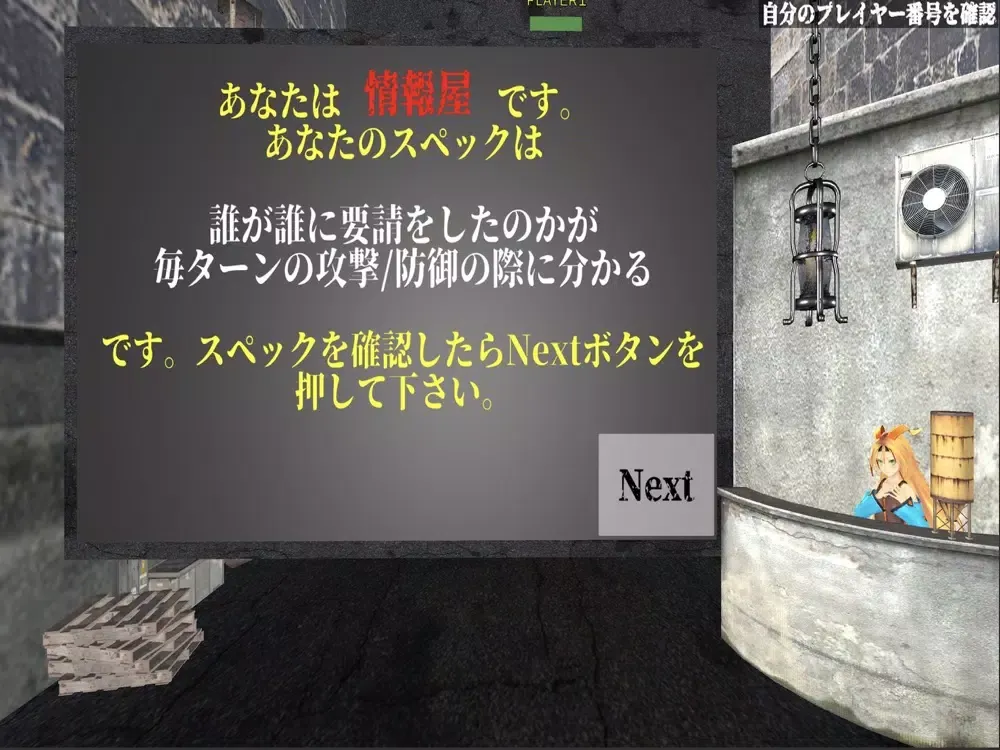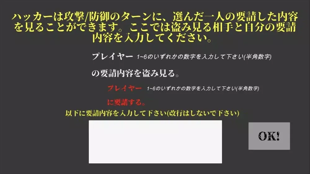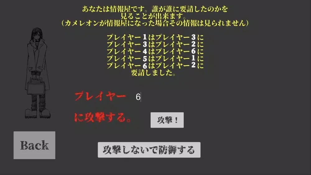 誰か1人のプレイヤーに攻撃をするか、攻撃をせずに防御を選択出来ます。ここでは要請された内容とスペックによっては追加の情報も得ることが出来ます。それらの情報と自分が仕掛けた情報などをもとに選択をします。