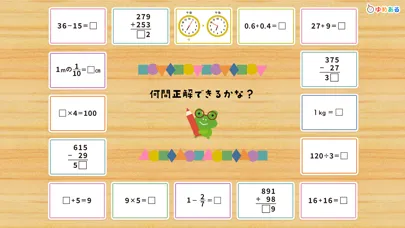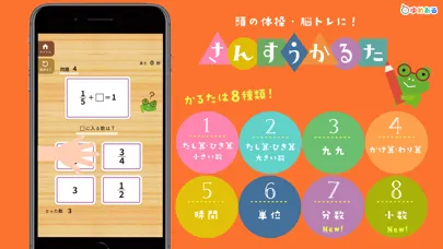 たし算・ひき算、九九、かけ算・わり算、時間、単位、分数、小数をかるたゲームと組み合わせた学習アプリです。