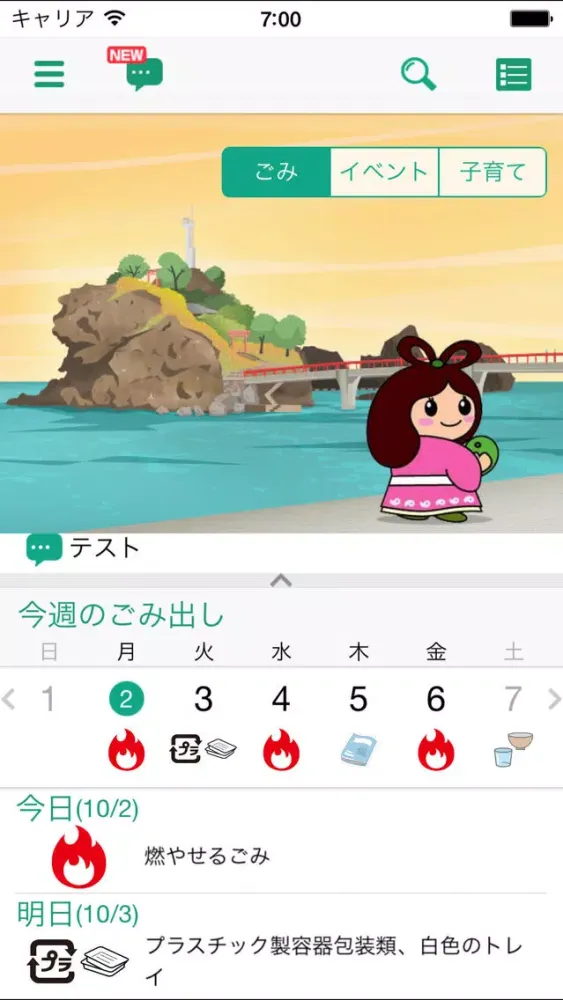 今日と明日、週ごと、月ごとの3パターンによるごみ収集日程を一つの画面ですぐに確認することができます。