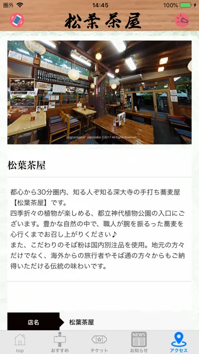 松葉茶屋アプリは、東京都調布市深大寺元町にある蕎麦屋「松葉茶屋」の公式アプリです。