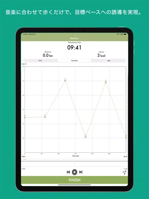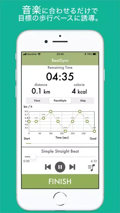 BeatSync は音楽のリズムに合わせて歩くだけで、目標のペース配分通りのウォーキングを実現することができるアプリケーションです。楽曲の解析機能を搭載し、歩行ペース誘導に適する楽曲を抽出・選定することが可能です。