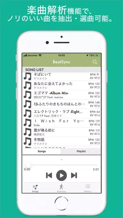 アプリ起動時に、楽曲のBPMとRhthmValue(RV:リズムの明確さ)を解析。 BPMとRVを基に、歩行ペース誘導に適する楽曲を自動で選定します。