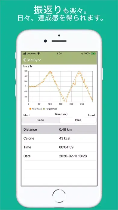 歩行ペース誘導終了後に、結果画面を表示。過去の歩行を振り返り、次に繋げることが可能です。
