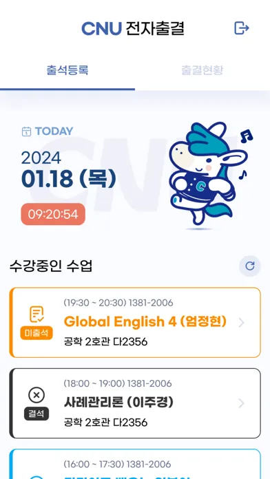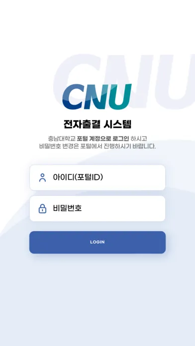 충남대학교의 전자출결 모바일 서비스로 학생 수강 과목에 대한 전자출결 기능을 사용할 수 있습니다.