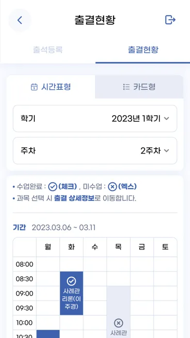 - 학생의 학기 별 수강 시간표 조회 및 출결 현황을 조회할 수 있습니다.