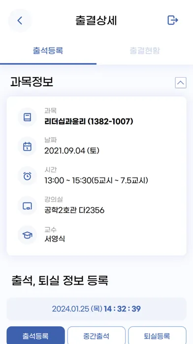 - 과목을 선택하여 현재 수업에 대한 전자출결 기능을 사용할 수 있습니다.