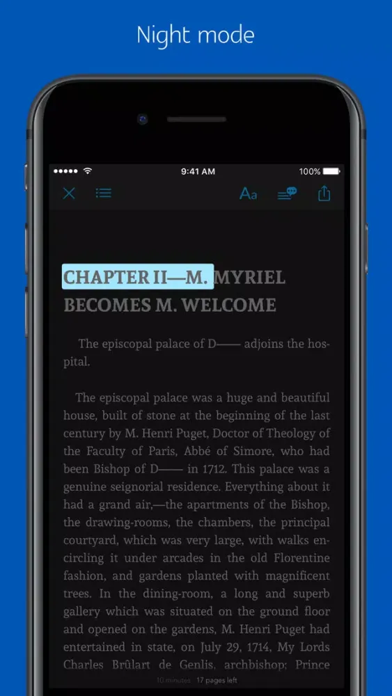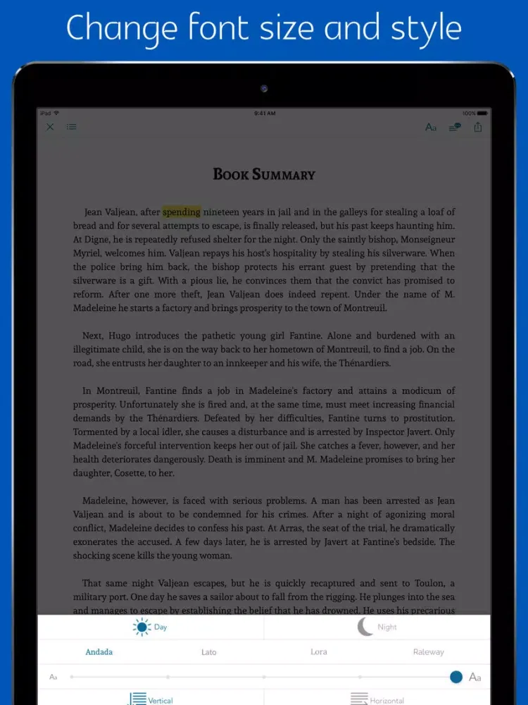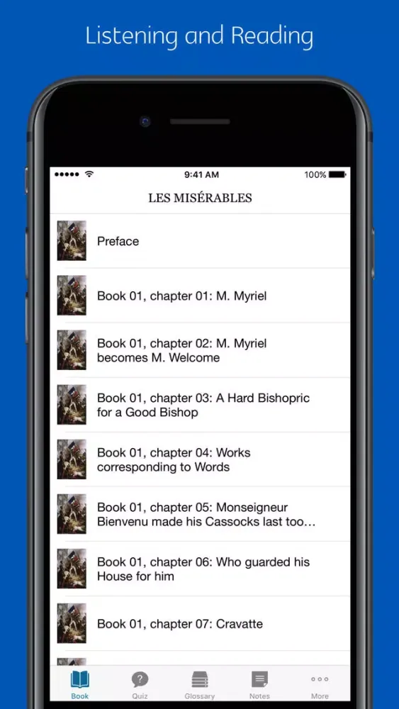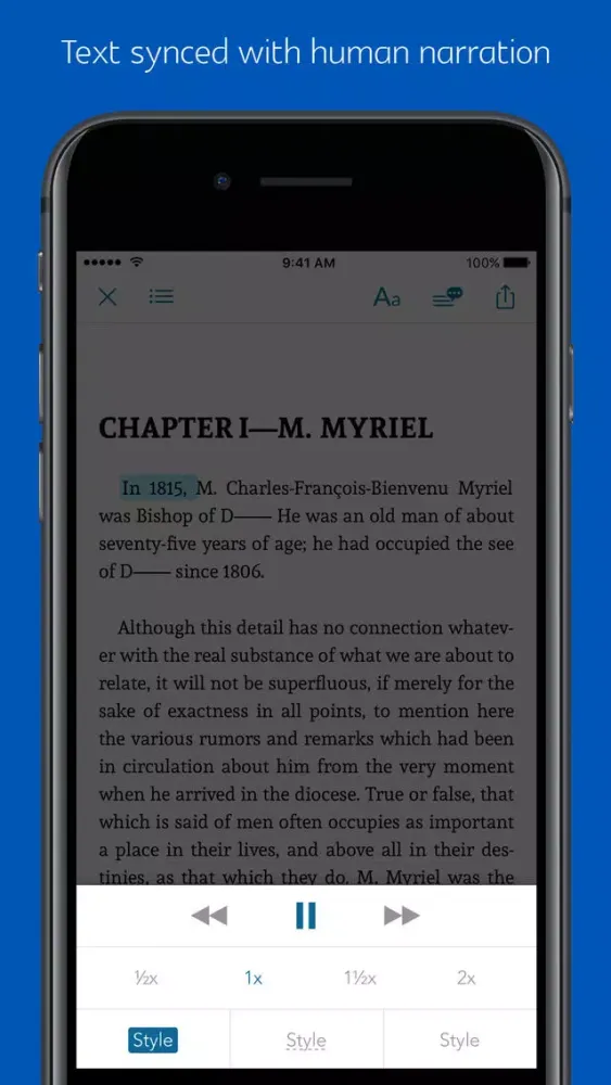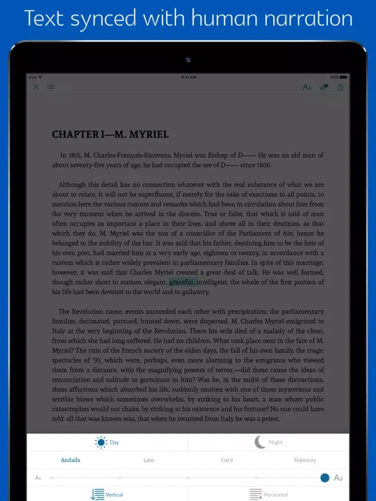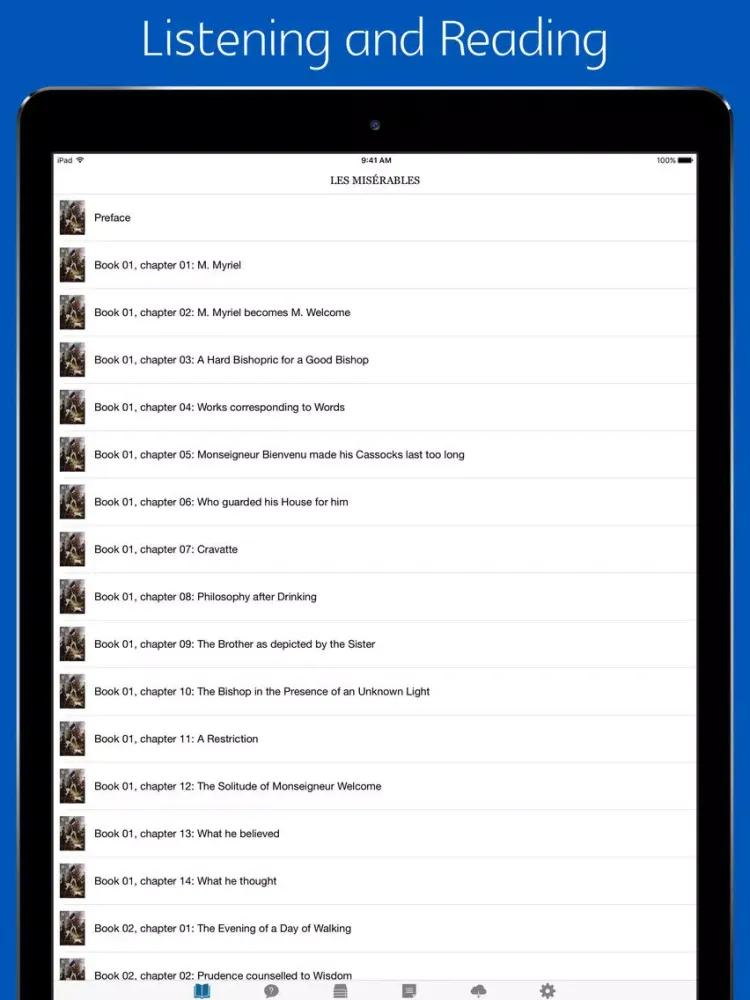 This app combines the famous novel "Les Miserables" by Victo Hugo with professional human narration. Its read-aloud feature (a professional narration synchronised with the highlighted text.) will help you to enjoy your favourite book in a new way.