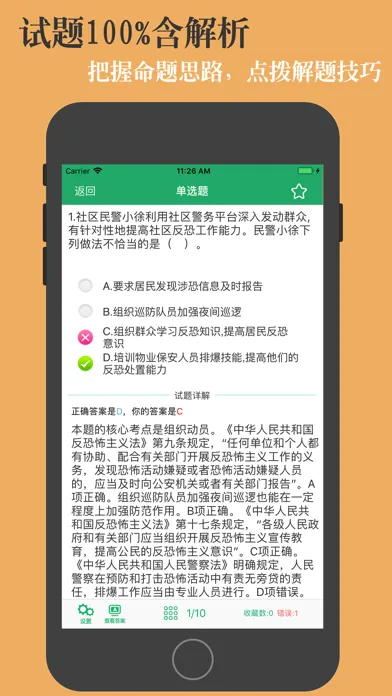 2、随机测试:随机生成100道试题模拟测试,检验复习成果,可自动将错题加入到错题库。