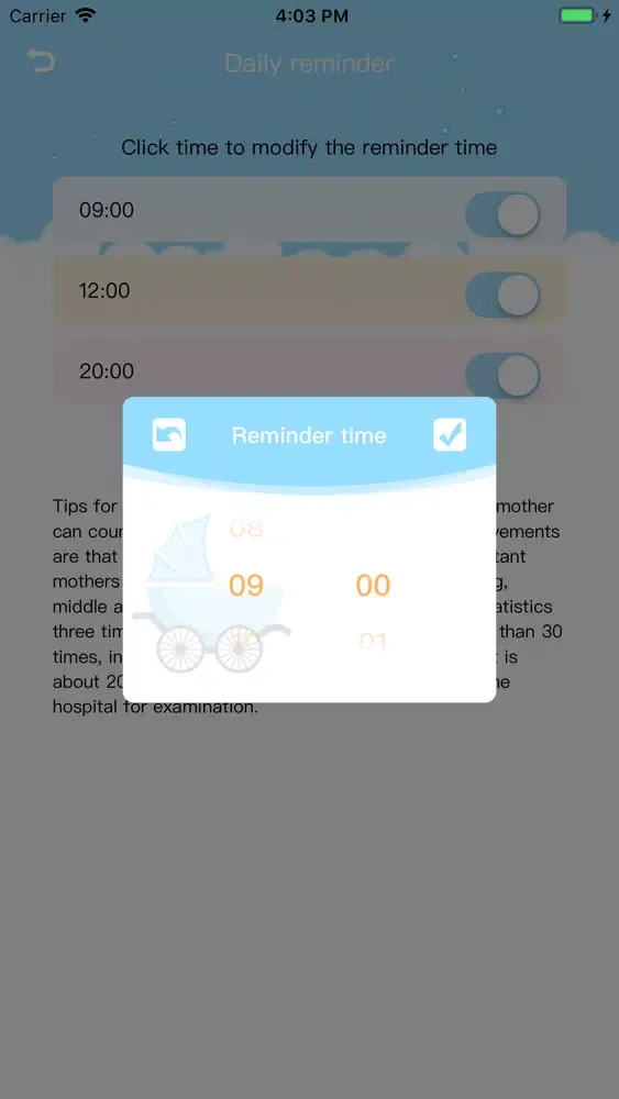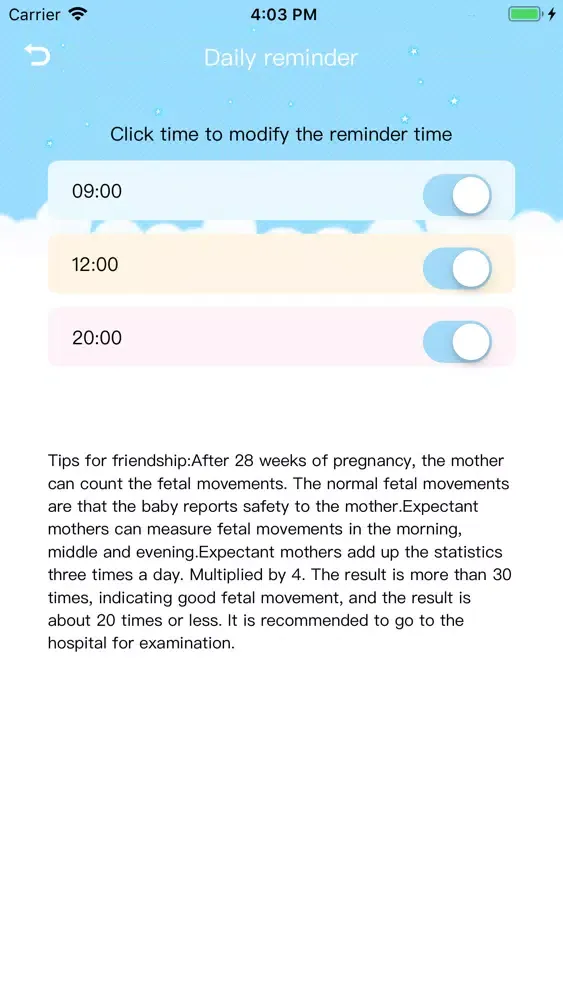Fetal movement can reflect the baby's growth.This software provides you with the function of fetal movement counting, as well as the function of historical data statistics, presentation and retention of fetal movements, so as to help you master the laws of fetal movements and ensure the healthy growth of the fetus
