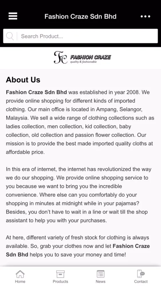 Fashion Craze Sdn Bhd was established in year 2008. We provide online shopping for different kinds of imported clothing. Our main office is located in Ampang, Selangor, Malaysia. We sell a wide range of clothing collections such as ladies collection, men collection, kid collection, baby collection, old collection and passion flower collection. Our mission is to provide the best made imported quality cloths at affordable price.