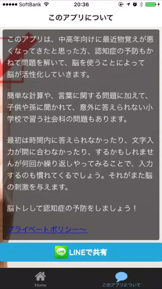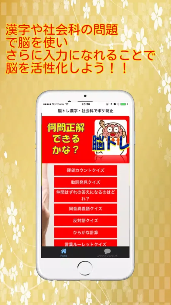 このアプリは、中高年向けに最近物覚えが悪くなってきたと思った方、認知症の予防もかねて問題を解いて、脳を使うことによって脳が活性化していきます。