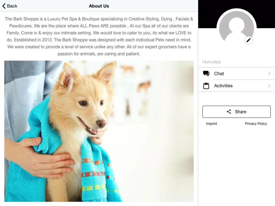 The Bark Shoppe is a Luxury Pet Spa & Boutique specializing in Creative Styling, Dying , Facials & Pawdicures. We are the place where ALL Paws ARE possible . At our Spa all of our clients are Family. Come in & enjoy our intimate setting. We would love to cater to you, its what we LOVE to do. Established in 2012. The Bark Shoppe was designed with each individual Pets need in mind. We were created to provide a level of service unlike any other. All of our expert groomers have a passion for animals, are caring and patient.