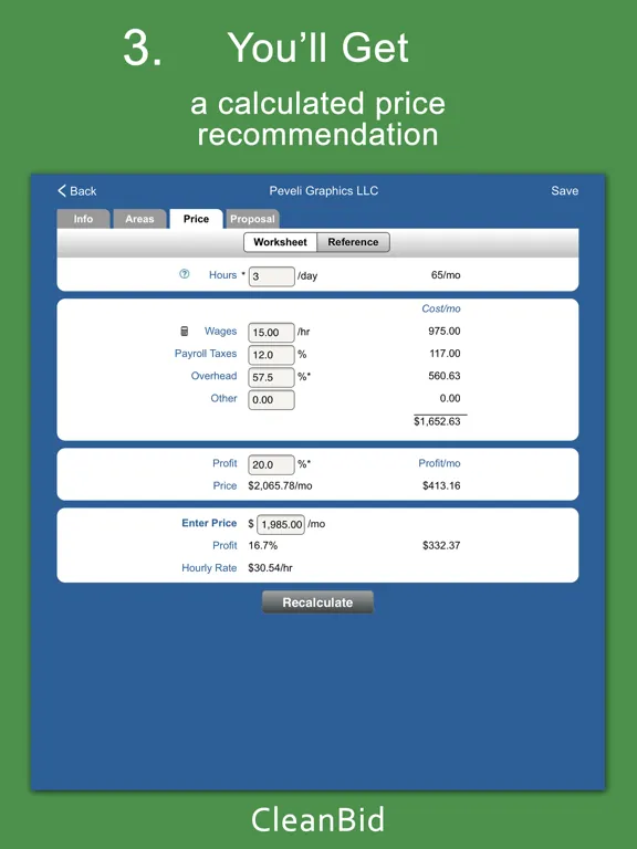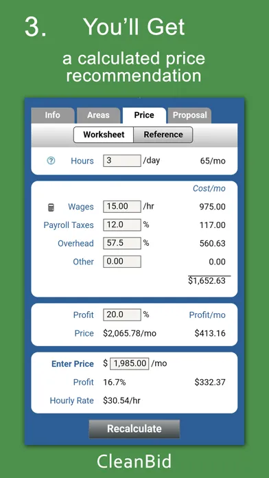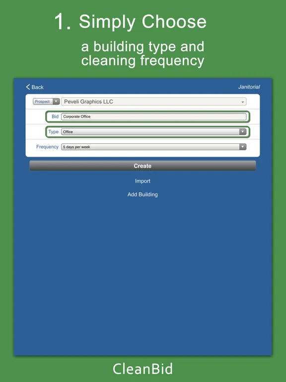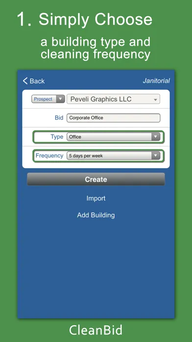 • Fast and Easy! Give the bid a name, pick a building type, choose a cleaning frequency - you’ll get a suggested price and professional proposal.