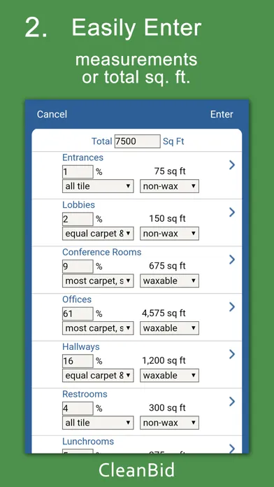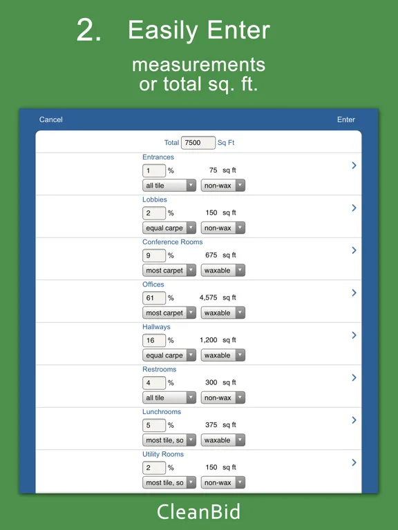 • No Measurements? No Problem. If you have a list of specific measurements you can easily enter them; but, if you don’t, just enter an estimate of the size of the building and our EXPRESS feature will do the rest, loading measurements and cleaning tasks for you – automatically.