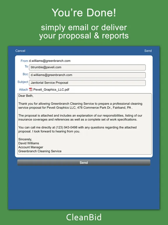 • Email Verification! When emailing, your proposal will automatically appear as an attachment with a professionally- worded cover letter and prospect’s email address already filled out for you. Plus, we verify the date and time it was successfully sent, delivered and opened.