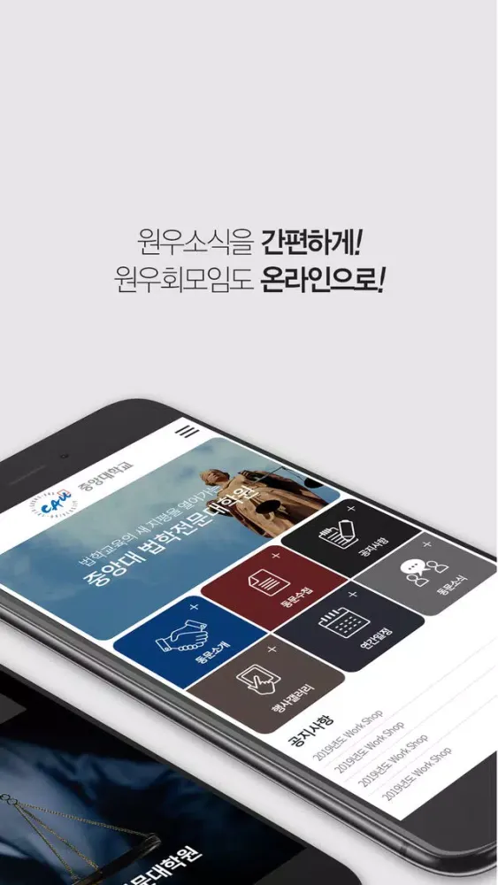 중앙대학교 법학전문대학원 소식과 동문 정보를 열람할 수 있는 모바일 수첩 어플리케이션입니다. 중앙대학교 법학전문대학원 동문 및 교직원만 이용 가능합니다. 또한 모바일 수첩에서 사용되는 모든 데이터는 중앙대학교 법학전문대학원 학생회에서 직접 관리하며, 원우회원 본인이 직접 자기정보를 수정할 수 있습니다. 본 어플리케이션과 관련하여 문의사항 있으시면 중앙대학교 법학전문대학원 학생회로 연락주시기 바랍니다.