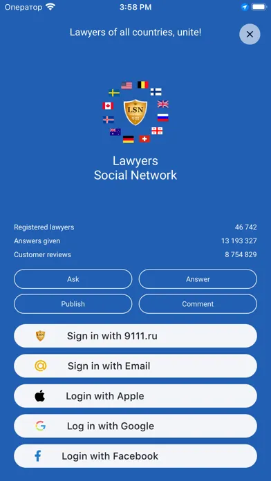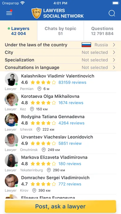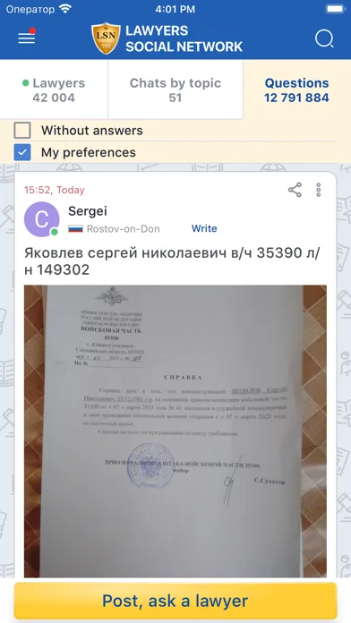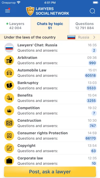 More than 40 thousand lawyers from more than 100 countries have already been registered in the LSN mobile application. LSN lawyers answer users' questions for free and have already given more than 14,000,000 answers, which can be found in the application database. For convenience, all questions and answers are grouped in chats by topic.