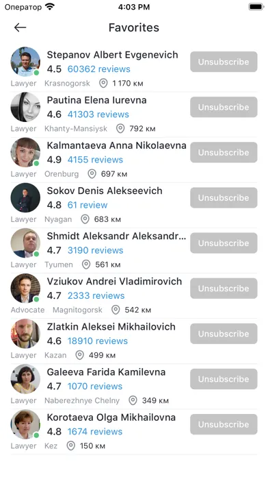 1. Lawyers. This tab opens a list of lawyers registered in the application and lawyers who are online and ready to answer users' questions. The list is displayed according to the rating in the region (country/city) where the user is currently located. However, the service allows you to find the right lawyer in any region (country/city) and get advice in any language.