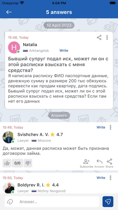 If you are in a difficult situation and you need a lawyer's advice, then you have come to the right place. In the LSN application, the user can ask a question of interest to him completely free of charge. According to statistics, lawyers answer 80% of questions. Almost all questions that are clearly formulated receive a free answer from one or more lawyers.