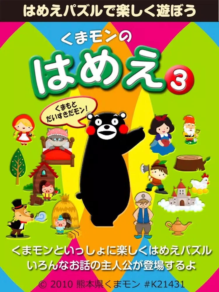 子供にも大人にも大人気のくまモンのはめえパズル第3弾「くまモンのはめえ(3)」。赤頭巾ちゃん、三匹のこぶた、白雪姫、ジャックと豆の木、アラジンと魔法のランプ、そしてくまモンや熊本の物産編もあるよ。ぜひ挑戦してね。