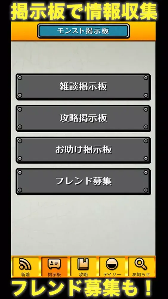 掲示板では「雑談」「攻略」「お助け」「フレンド」と