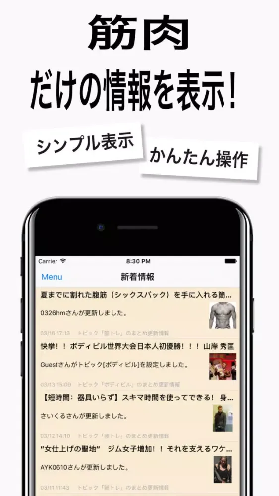 シンプルな表示で、他の雑音を気にせず筋肉のニュースのみ閲覧できます。