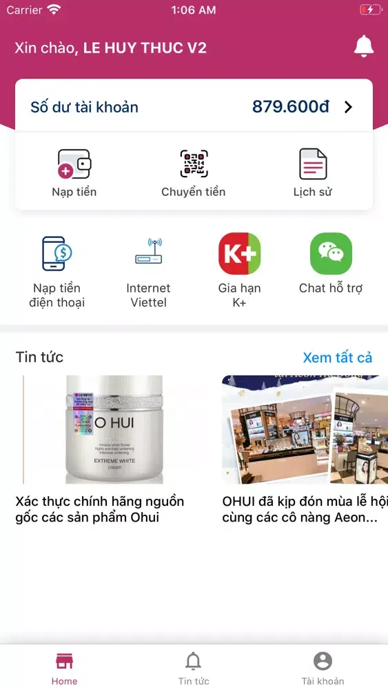 + Nhận chuyển khoản từ tài khoản khác.