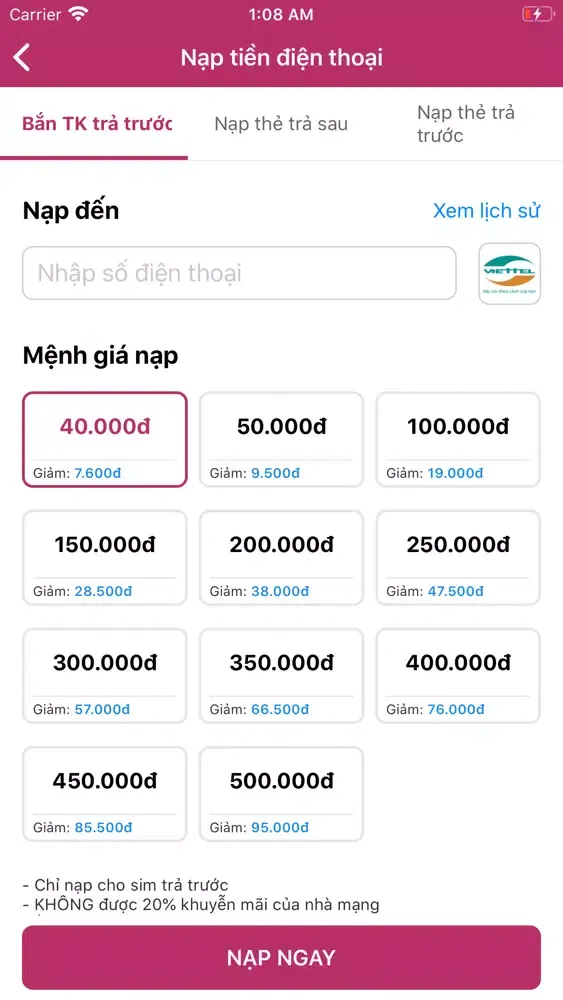 - Nạp thẻ trả trước/trả sau 3 mạng: Viettel, mobifone, Vinaphone (chiết khấu từ 15-25%)