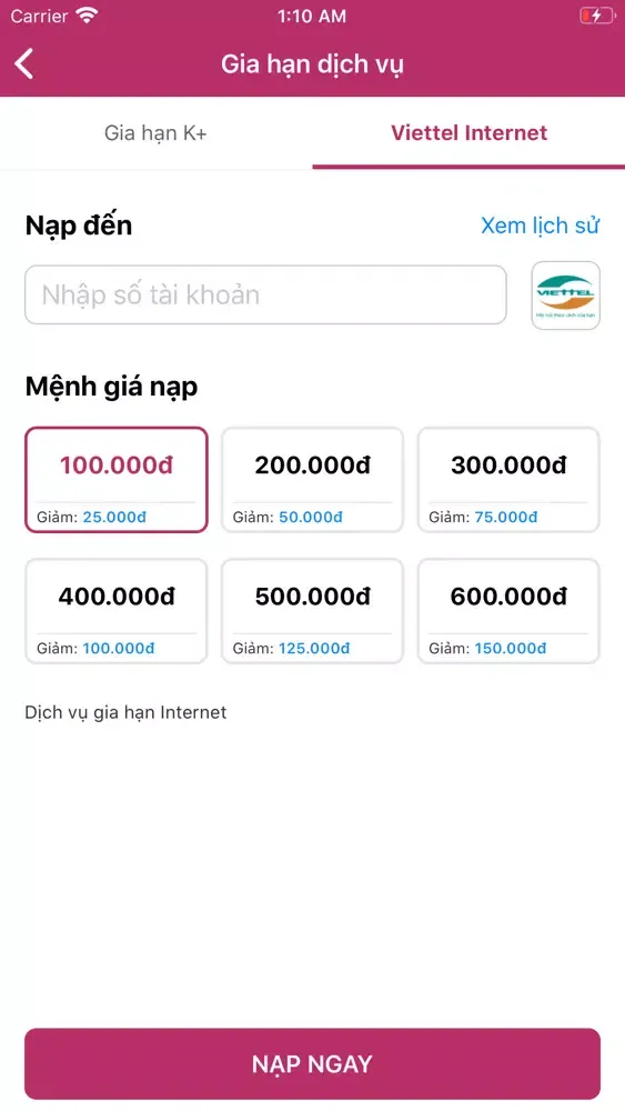 - Nhập số điện thoại/mã thuê bao internet/ mã k+