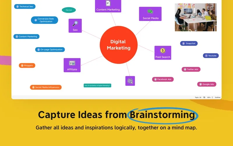 • Outliner: A new way to view, organize and manage the topics. Switch Outliner and Mind Map back and forth helps you to read your work from different perspectives.