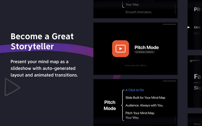 • Pitch Mode: Your mind map is a slide show, one click to go. Pitch Mode generates smooth transitions and layouts for your mind map.